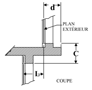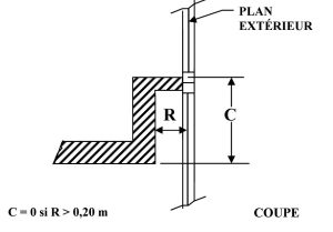 Pour pouvoir prendre en compte la hauteur d'une allège dans le calcul de C, le retrait R ne devra pas excéder 0,20 m, mesuré par rapport au nu du vitrage intérieur. De plus, les vitrages superposés doivent être maintenus en partie haute de l'allège. La tenue du vitrage supérieur ne doit pas être subordonnée à la tenue de la façade située sous la coupure.