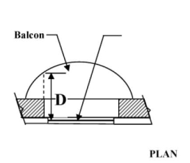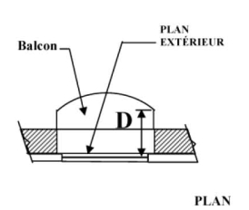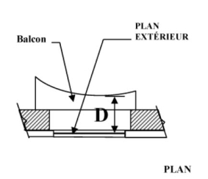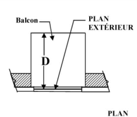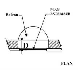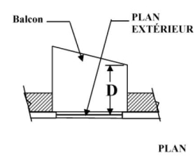 En présence d'un balcon ou d'une avancée, placés devant une baie et répondant aux exigences du paragraphe 1.2.2. D est la plus courte distance mesurée au droit de la baie, perpendiculairement à la façade.