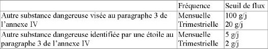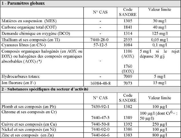 Les substances dangereuses marquées d'une * dans le tableau ci-dessus sont visées par des objectifs de suppression des émissions et doivent en conséquence satisfaire en plus aux dispositions de l'article 22-2-III de l'arrêté du 2 février 1998 modifié.