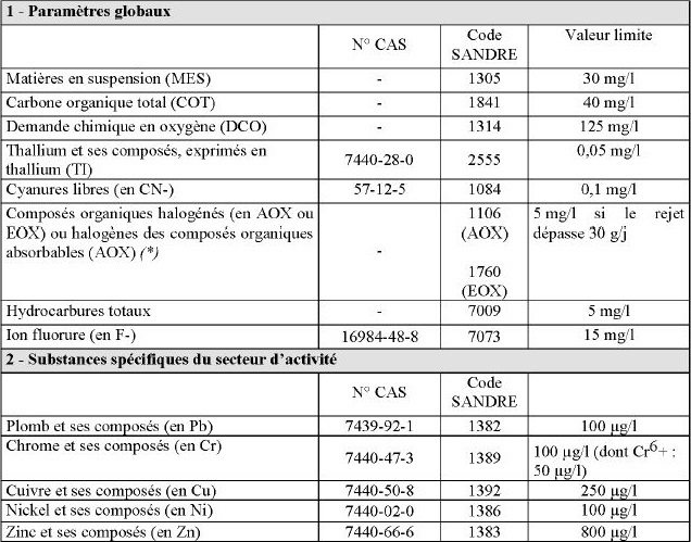 Par ailleurs, pour toutes les autres substances susceptibles d'être rejetées par l'installation, les eaux résiduaires rejetées au milieu naturel respectent les valeurs limites de concentration fixées suivantes. Les rejets respectent les valeurs limites de concentration suivantes :