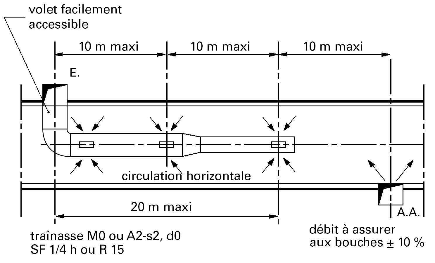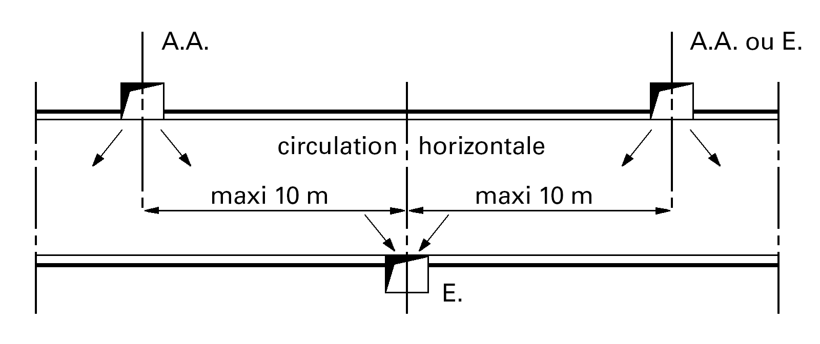 Dans les circulations horizontales communes, la distance maximale entre deux bouches d'extraction de fumée, ou entre une bouche d'extraction de fumée et une bouche d'amenée d'air est de 10 mètres si le parcours est rectiligne, 7 mètres dans le cas contraire.