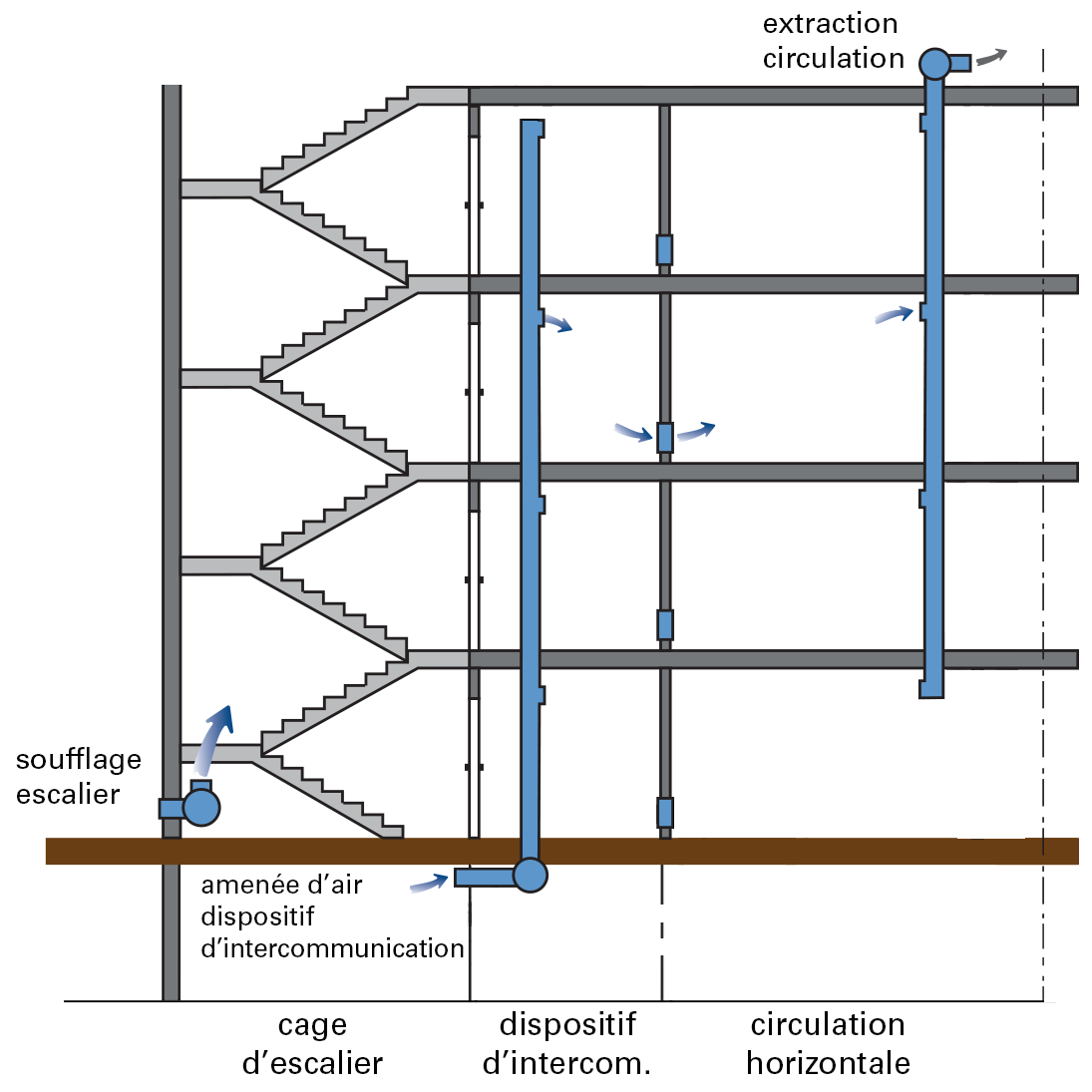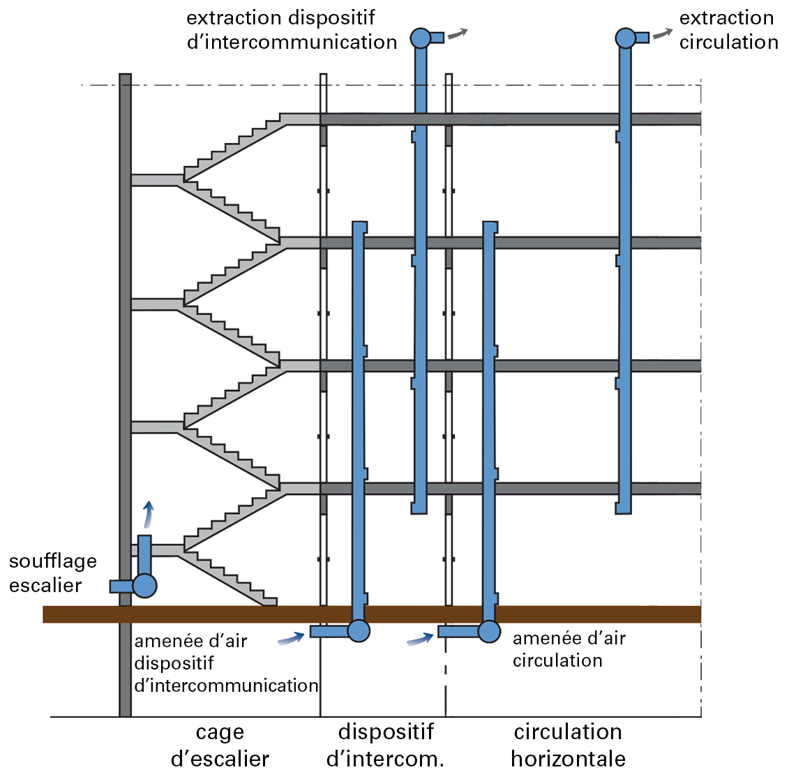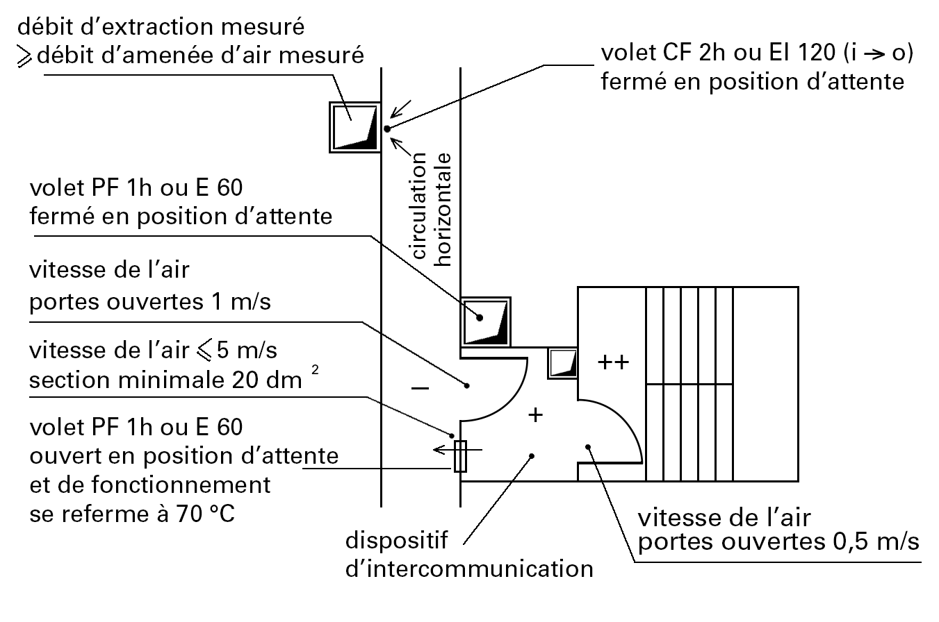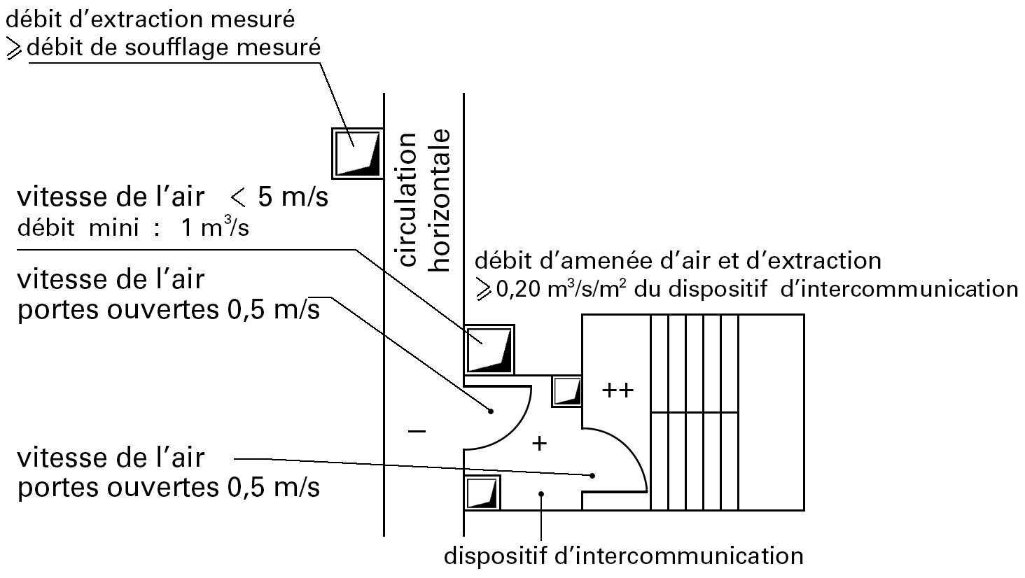Les débits d'amenée d'air et d'extraction de fumée dans les dispositifs d'intercommunication sont au minimum de 0,20 mètre-cube par seconde par mètre-carré de surface de ces derniers. Les dispositifs d'intercommunication devant toujours être en surpression par rapport à la circulation horizontale commune, le débit d'amenée d'air est légèrement supérieur au débit d'extraction de fumée.