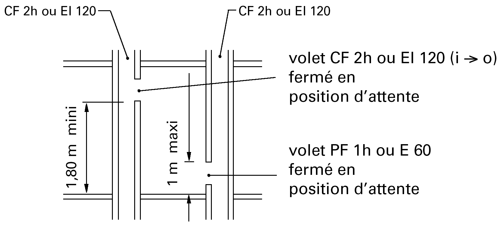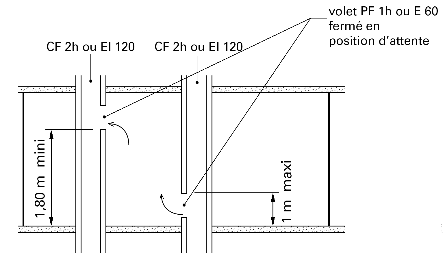Les bouches d'amenée d'air des dispositifs d'intercommunication ont leur bord inférieur à une hauteur minimale de 1,80 mètre du plancher. Elles sont équipées de volets pare-flammes de degré une heure ou E 60, fermés en position d'attente.