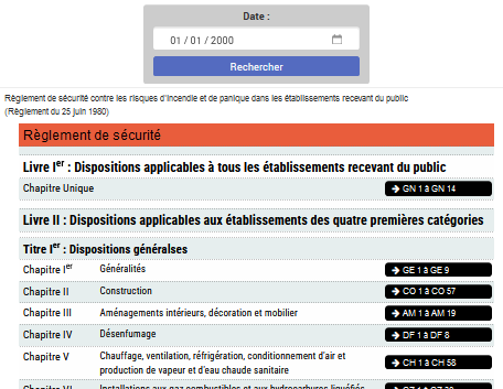 "HistoriqueApercu de l'historique ERP " : versions antérieures du règlement de sécurité ERPÉtablissements Recevant du Public depuis 1954(saisir une date : permis de construire, travaux... et accéder en un clic à la version consolidée du règlement applicable à la date saisie) |